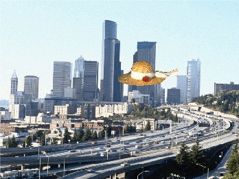 | Seattle, Washington - March 19, 1991 - A roundish, brimmed craft apparently made of a substance resembling straw passes over Interstate 5, its jaunty "ribbon" and carnation-like object flapping. Strangely, though the incident occurred in broad daylight above a busy highway, none of the motorists panicked as one might expect. |